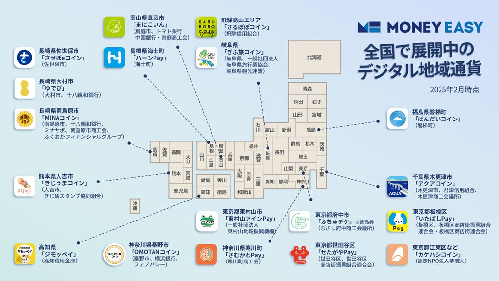 岐阜県飛騨高山地域「さるぼぼコイン」/千葉県木更津市「アクアコイン」/東京都江東区「カケハシコイン」/長崎県南島原市「MINAコイン」/東京都世田谷区「せたがやPay」/岐阜県「ぎふ旅コイン」/熊本県人吉市「きじうまコイン」/福島県磐梯町「ばんだいコイン」/東京都府中市「ふちゅチケ」※商品券/東京都板橋区「いたばしPay」/長崎県佐世保市「させぼeコイン」/岡山県真庭市「まにこいん」/東京都東村山市「東村山アインPay」/長崎県大村市「ゆでぴ」/高知県「ジモッペイ」/神奈川県秦野市「OMOTANコイン」/島根県海士町「ハーンPay」/神奈川県寒川町「さむかわPay」