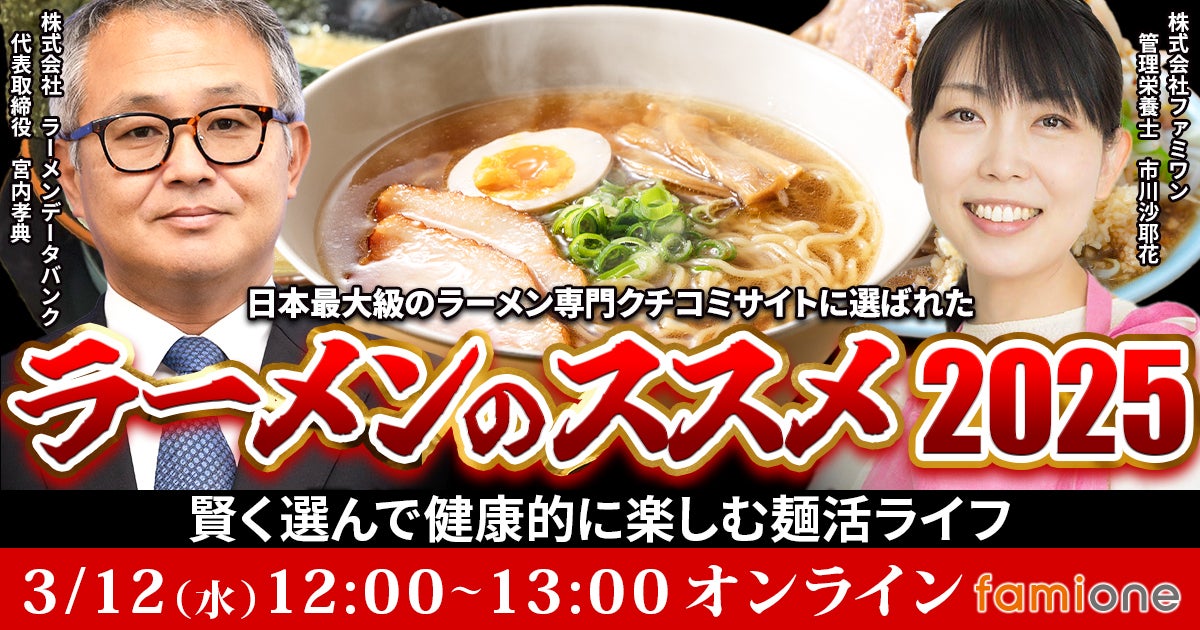 「子どもを願うすべての人によりそい 幸せな人生を歩める社会をつくる」をビジョンに掲げ、法人の従業員向け福利厚生や自治体の住民向け支援を行うヘルスケアサポートサービス「ファミワン」 https://famione.com/benefit/などを展開する株式会社ファミワン(本社:東京都渋谷区、代表取締役:石川勇介)は、「ファミワンラーニング」の開催として無料オンラインセミナー「賢く選んで健康的に楽しむ 麺活ライフ 〜日本最大級のラーメン専門クチコミサイトに選ばれたラーメンのススメ2025〜 」を開催します。