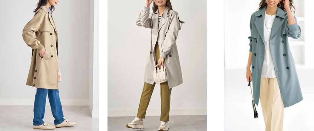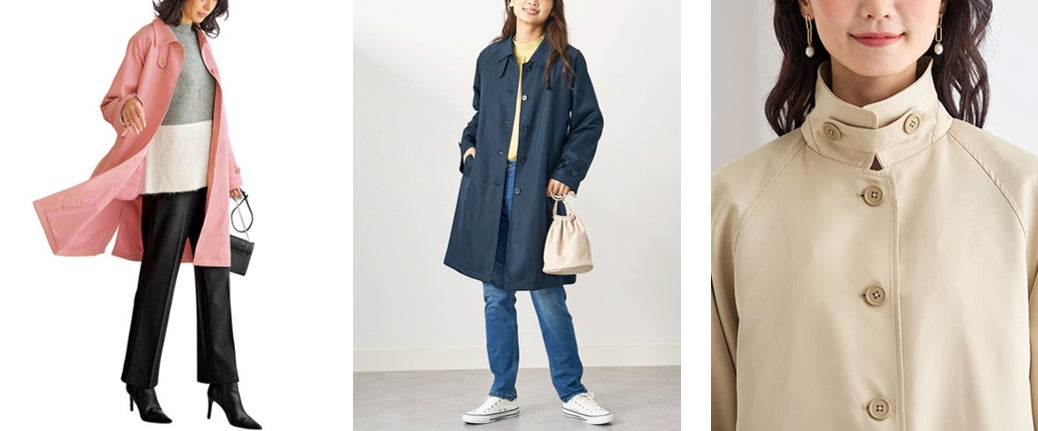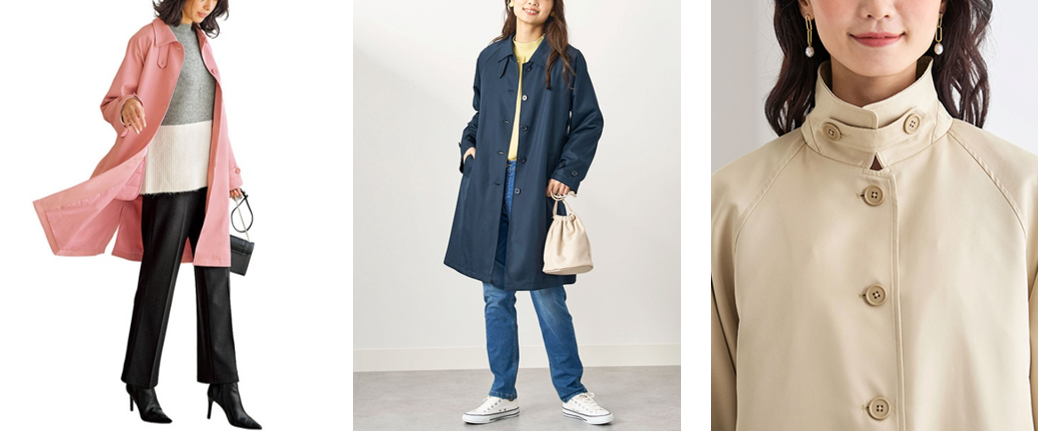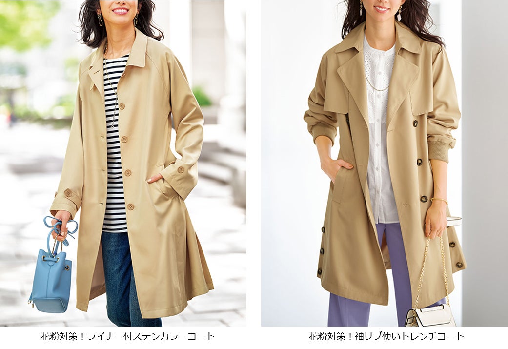 今回は、美しいシルエットが特長の「花粉対策!ライナー付ステンカラーコート」と、ときめくディテールを盛り込んだ「花粉対策!袖リブ使いトレンチコート」をご紹介します。ステンカラーコートは、取り外し可能なライナー付きで、肌寒い時期からあたたかい時期まで長く使える大活躍の1着です。トレンチコートは、トレンドをおさえた袖リブデザインで、腕まくりコーデがこなれ感を演出します。どちらのコートも表面には花粉が付きにくく、落ちやすい加工をプラス。家に入る前に払うことで花粉の持ち込みをおさえることができます。