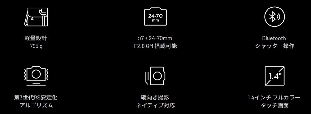 DJI RS/Ronin シリーズで最も軽量な795 gながら、各社の主要ミラーレスカメラとレンズに対応
