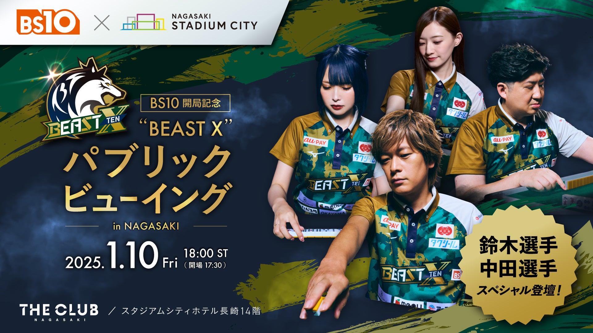 ジャパネットグループでイベント企画・運営事業を担う株式会社リージョナルエックス長崎(本社:長崎県長崎市/代表取締役社長:岩下英樹)と、全国無料BS放送「BSJapanext」を運営する株式会社ジャパネットブロードキャスティング(本社:東京都中央区新川/社長執行役員:佐藤崇充)は、2025年1月10日(金)に新BS放送局『BS10(ビーエステン)』の開局を記念し、麻雀プロリーグ戦 Mリーグチーム“BEAST X(ビーストテン)”主催のパブリックビューイングイベントを長崎スタジアムシティにて初開催いたします。