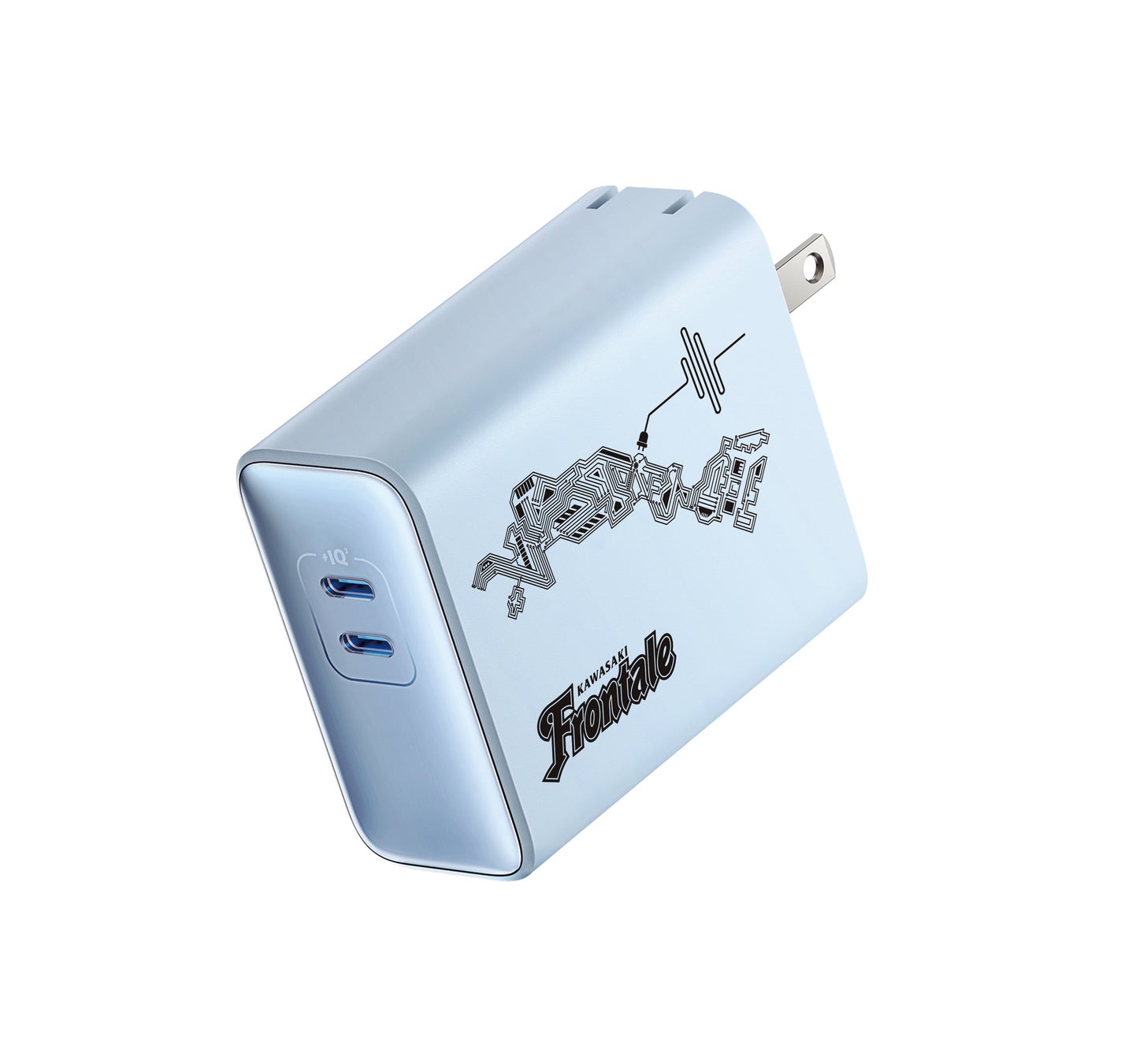 USB急速充電器としては合計最大45W出力の2つのUSB-Cポートより、iPhone 15等のスマートフォンからMacBook Air等のノートPCまでの幅広い機器を2台同時に充電することができます。また、モバイルバッテリーとしても最大20W出力が可能な他、5000mAhのバッテリー容量を備えており、外出先でもiPhone 14を約1回急速充電できます。コンセントに挿すだけで本体へ充電されるため、充電忘れを防ぎ、急な外出等で使用する際も安心です。川崎フロンターレのロゴと川崎市を象ったイラストをプリントし、フロンターレカラーのブルーの本体でご用意いたします。