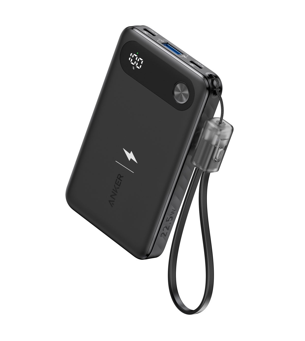 iPhone 15を約2回充電可能な10000mAhの大容量ながら約16mmの世界最薄クラス(※1)の設計のため、バッグやポケットに入れての持ち運びにも最適。最大22.5Wの出力で、iPhone 15シリーズを含むスマートフォンを急速充電できます。入出力可能なUSB-Cポートを2つ搭載し、USB-Aポートと合わせると3台の機器を同時に充電することができます。Ankerらしいチャージングマークのプリント入りです。