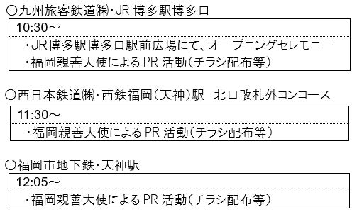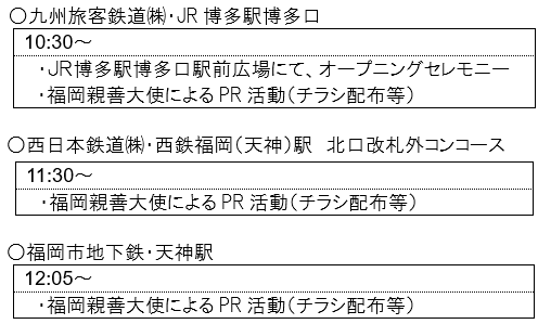 当キャンペーンでは、福岡親善大使の皆さんを1日鉄道警察隊長、1日駅長に迎え、西鉄福岡(天神)駅、JR博多駅、地下鉄天神駅にて鉄道の安全運行・車内事故防止に向けたPR活動を行います。