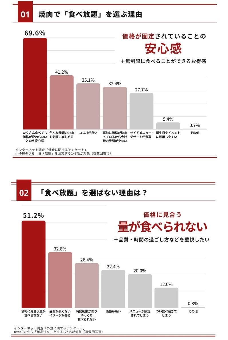 そのような状況下で、焼肉の主流である「食べ放題」の価値は、お得感から「価格固定の安心感」に変化しているのではないかと考えます。また、お客様の嗜好が多様化し外食に求めるものも変化するなかで、 「量より質」を求めるニーズも高まっています。