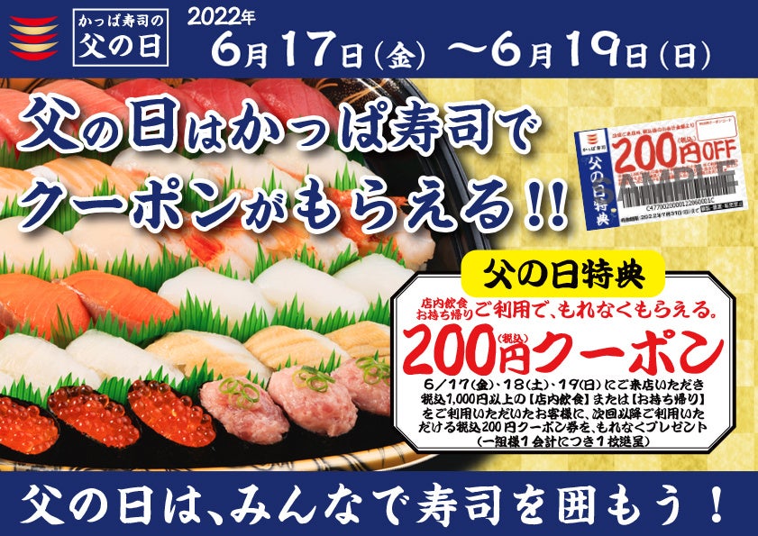 【父の日特典】お父さんありがとう!の気持ちを込めて200円(税込)OFFクーポンをプレゼント かっぱ寿司の“うまい!”お寿司でお祝いを