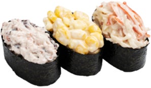 またかっぱ寿司を代表する『サラダ軍艦』、店内で素材とマヨネーズを丁寧に和えた『感動コーン』『かにカマサラダ軍艦』の『サラダ軍艦三種盛り』三貫110円(税込)も見逃せません。