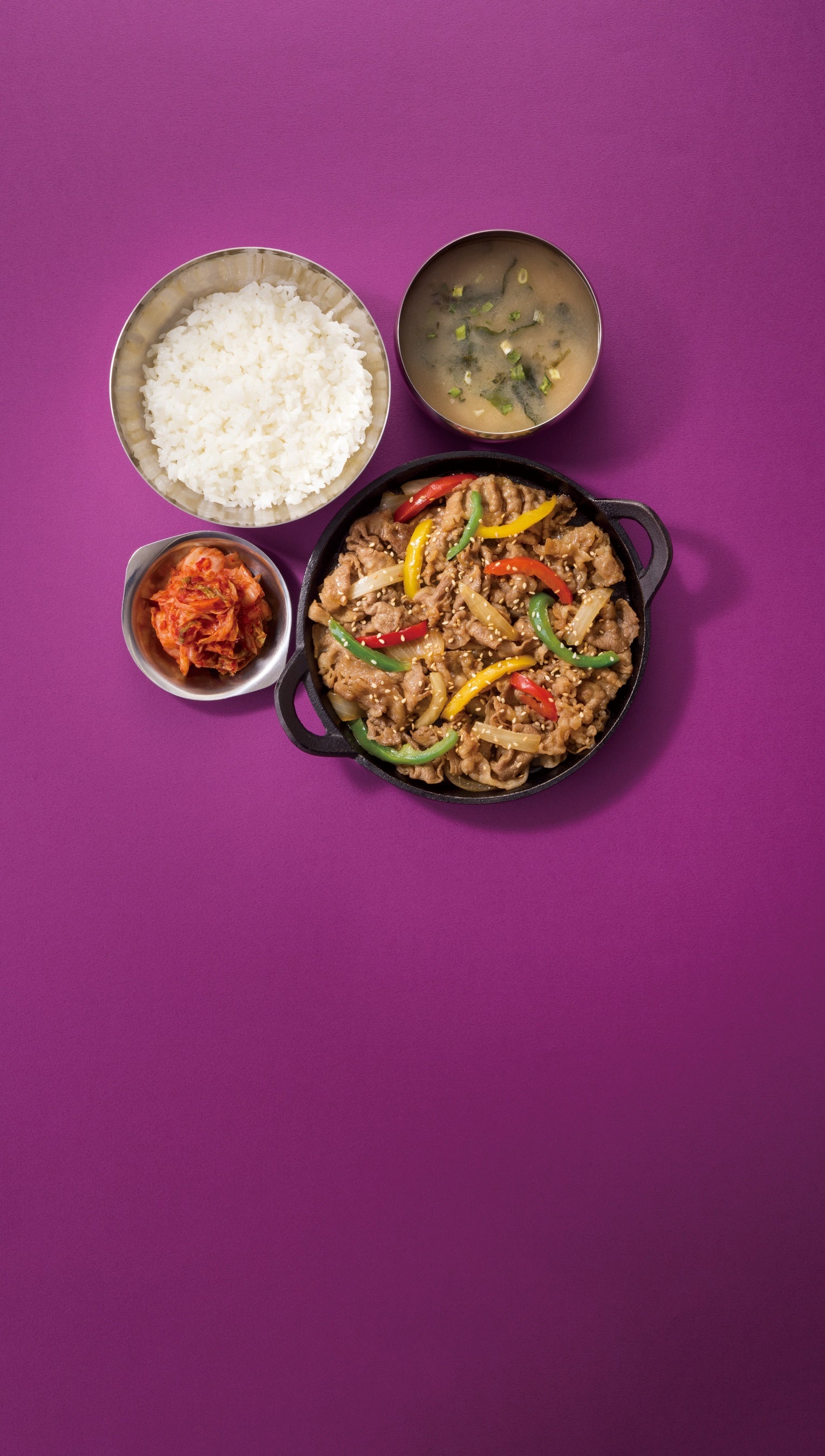 『鉄板牛プルコギ定食』は、旨みたっぷりの牛肉に玉ねぎと3色ピーマンを加え五感と食欲を刺激する仕立てとなっています。お客様には、鉄板に盛り付けた牛肉、玉ねぎ、3色ピーマンを、火の付いた五徳で熱々の状態で提供します。商品が運ばれてくる時から、甘辛たれとごま油の香ばしい香りが立ちのぼり、特製プルコギたれをかけると「ジュージュー」と食欲をそそる音が響きます。