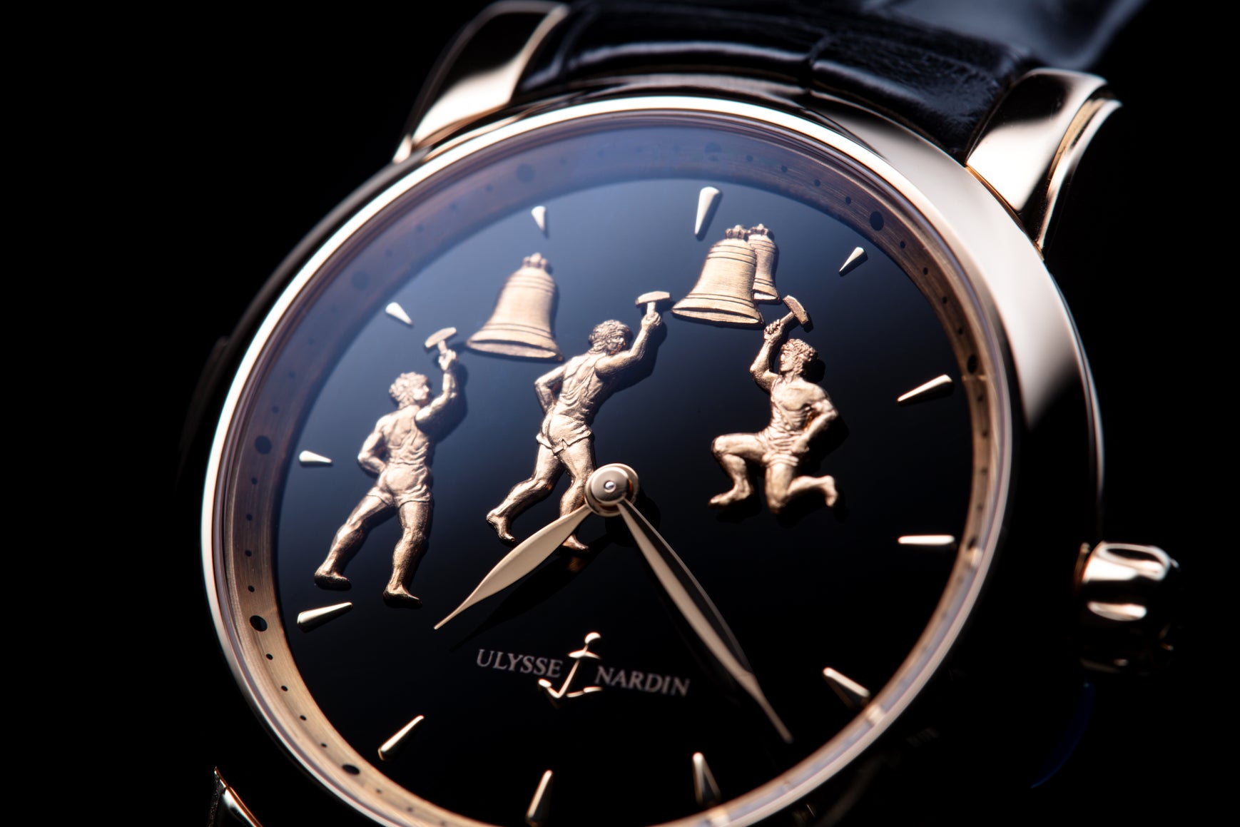 ミニッツリピーターにオートマタを組み合わせた世界限定50本モデル。世界三大機構と名高いミニッツリピーターと、からくりが動きチャイムを鳴らすオートマタを同時に搭載しており、ミニッツリピーターを動作させると、あたかも本当にダイヤル上の3人が鐘を打ち鳴らしているかのように、ハンマーを打つ様を見ることができます。ユリスナルダンが定期的に発表するオートマタ搭載のミニッツリピーターのうちの一本。世界限定50本の希少性と、オートマタとミニッツリピーターを組み合わせた技術の粋を楽しめる貴重なモデルです。