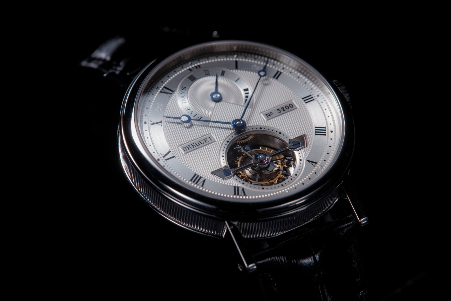 先端近くにポイントを配したブレゲ針、ケース側面へのコインエッジ、複雑なギョーシェ、細長いラグといった240年を超える歴史をもつブレゲのアイデンティティを詰め込んだクラシックコレクションの一本。シルバー仕上げのゴールドダイヤル。12時位置に5日間パワーリザーブ表示を備えたトゥールビヨン搭載モデルです。トゥールビヨンを発明した伝説の時計師として知られるブレゲがもし腕時計を造ったならこのモデルを発表していたであろうと想像できるほど色濃く伝統・DNAが伝えられています。3種類のギョーシェを使い分け、エレガントながら39mmケースサイズで実用的に仕上がっています。