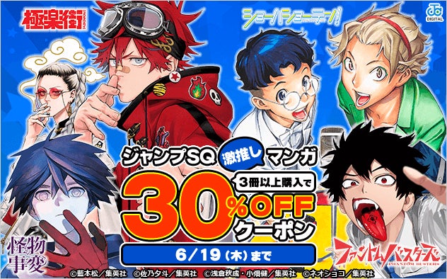 TOPPANホールディングス株式会社のグループ会社である、株式会社BookLive(本社:東京都港区・代表取締役社長:淡野 正)は、運営する総合電子書籍ストア「ブックライブ」にて、「ジャンプSQ.」(集英社)の激推しマンガを対象としたキャンペーンを開催いたします。本日6月13日(金)から6月19日(木)までの7日間限定で、『極楽街』や『ファントムバスターズ』など対象全16作品のうち3冊以上まとめてご購入いただくと、30%OFFになるクーポンをご利用いただけます。