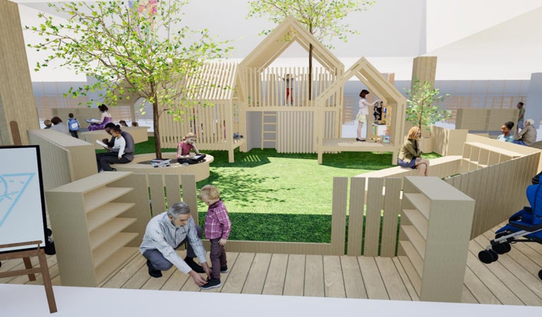 店内中央には天窓から差し込む光の下に、奈良の名産である吉野杉が使用された木製遊具や、芝生のある空間をつくり、約1万冊の絵本を販売します。また、奈良で創られた玩具などの体験・購入も可能です。