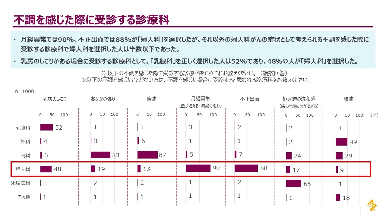 今回、乳がん・婦人科がんに関連が深い「乳房のしこり」「おなかの張り」「腹痛」「月経異常」「不正出血」「排尿時の違和感」「腰痛」について、それぞれの不調を感じた際に受診する診療科を選択してもらったところ(乳腺科、外科、内科、婦人科、泌尿器科、その他)、すべての症状と診療科の組合せ中、「月経異常」で「婦人科」の割合が最も高く90%、次いで「不正出血」で「婦人科」88%でした。