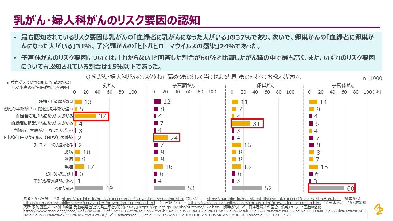 乳がん、子宮頸がん、卵巣がん、子宮体がんのリスク要因のなかで、最も認知されていた割合が高かったのは乳がんの「血縁者に乳がんになった人がいる」の37%であり、次いで、卵巣がんの「血縁者に卵巣がんになった人がいる」31%、子宮頸がんの「ヒトパピローマウイルスの感染」24%でした。