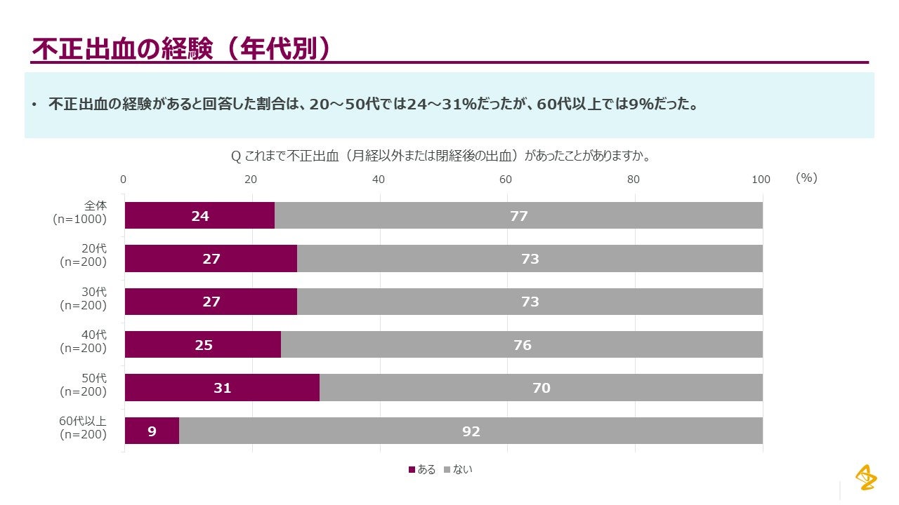 不正出血の経験を年代別にみると、20代27%、30代27%、40代25%、50代31%、60代以上9%が「ある」と回答しました(全体24%)。一方で、「不正出血があった際に、医療機関は受診しましたか」に対し「受診しなかった」と回答した人の割合は、20代46%、30代39%、40代41%、50代21%、60代以上29%でした(全体36%)。不正出血があった際に受診しなかった理由では、「様子をみたが、その後症状がなくなった」と回答した割合が60%で最も高く、次いで「受診が必要だと感じなかった」30%でした。