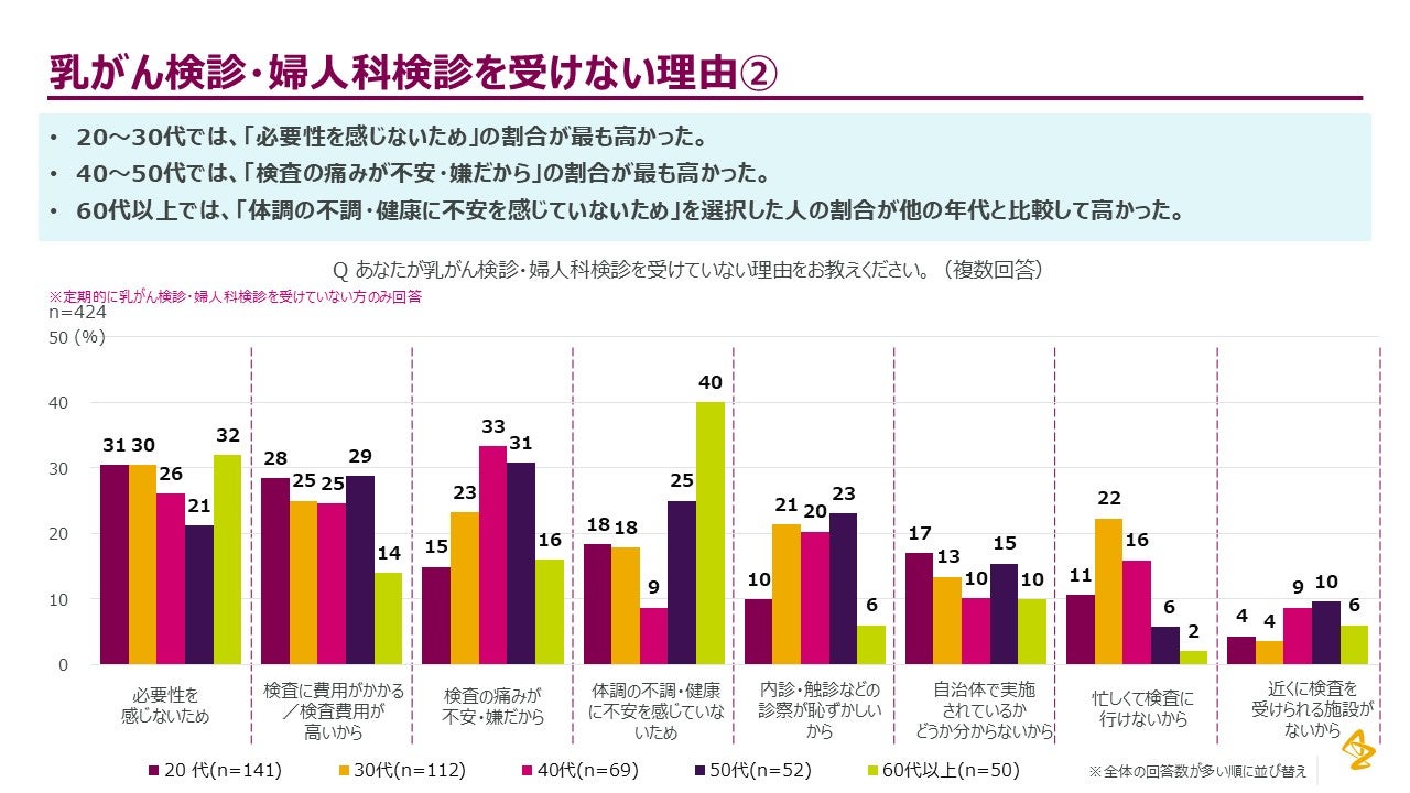 乳がん検診・婦人科検診を受けていない理由は、全体では「必要性を感じないため」と回答した割合が29%と最も高く、次いで「検査に費用がかかる/費用が高い」の25%、「検査の痛みが不安・嫌だから」の22%でした。検査を受けない理由で年代別に最も割合が高かったのは、20~30代では「必要性を感じないため」(20代31%、30代30%)、40~50代では「検査の痛みが不安・嫌だから」(40代33%、50代31%)でした。60代以上での割合が最も高かった「体調の不調・健康に不安を感じていないため」(40%)は、この項目を選択した人の割合が最も低い40代では9%であり、年代間で最も大きな差(31ポイント)が見られました。