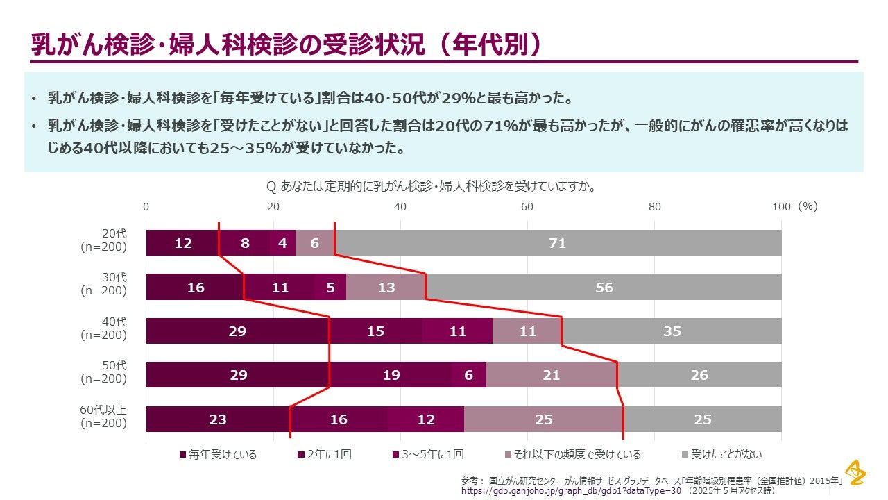 アストラゼネカの一般女性に対する乳がん・婦人科がん調査42%が乳がん検診・婦人科検診を 「受けたことがない」と回答