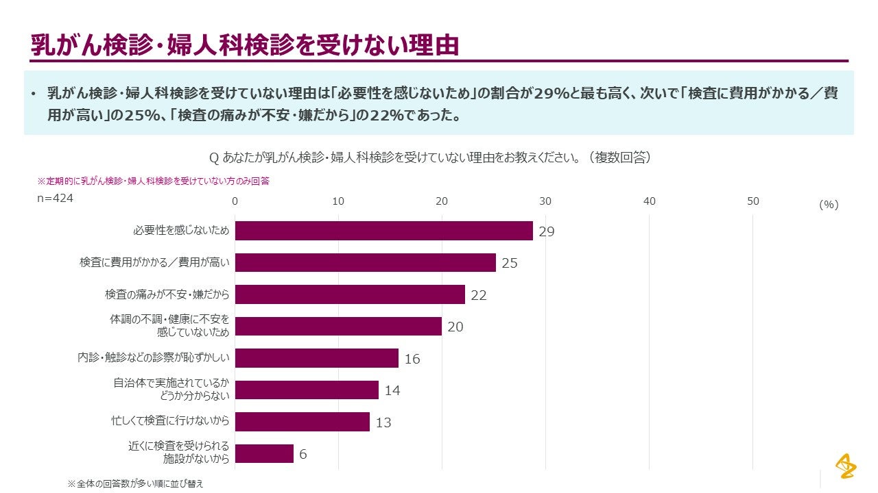 乳がん検診・婦人科検診を受けない理由は「必要性を感じない」がトップ 不正出血があっても、36%は医療機関を受診していなかった