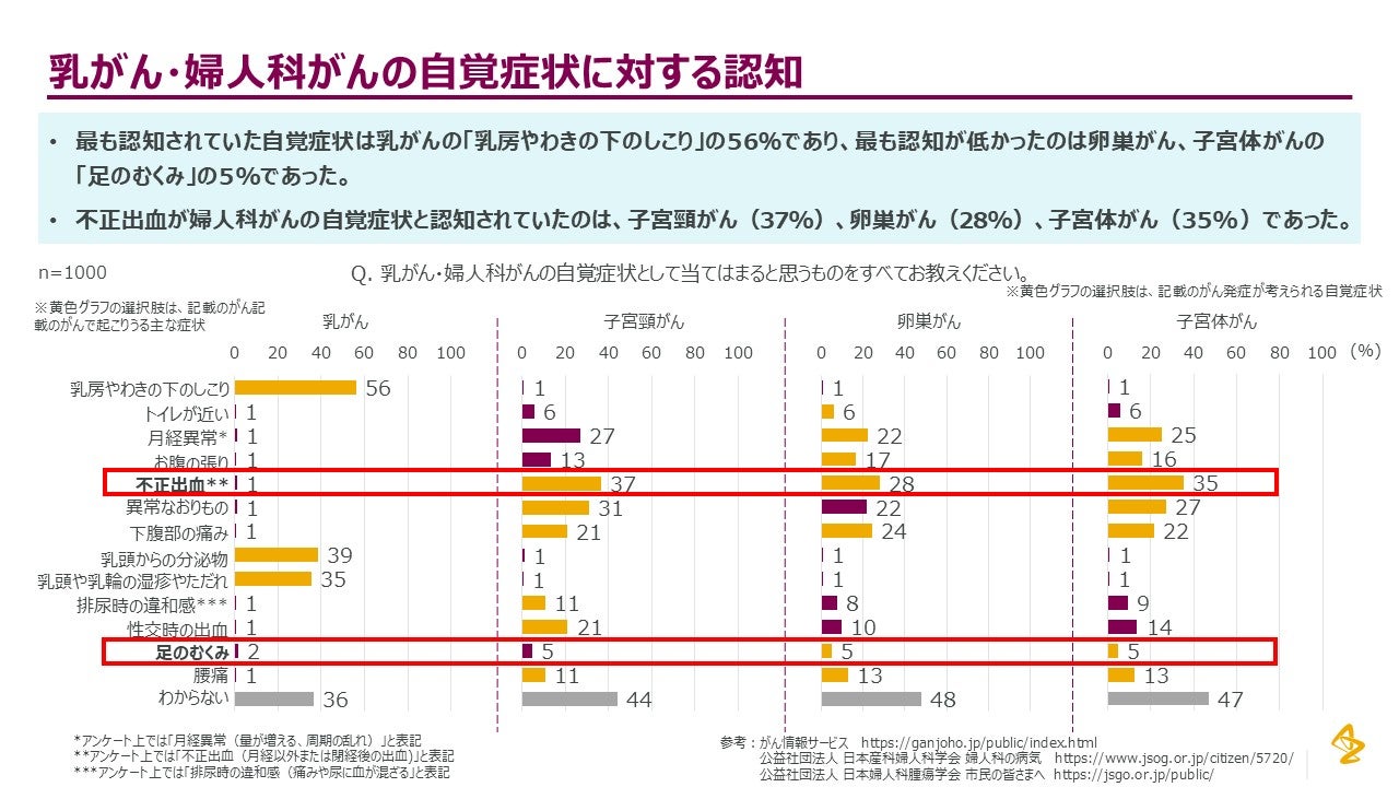 乳がん・婦人科がんの自覚症状のなかで、最も認知されていたものは乳がんの「乳房やわきの下のしこり」の56%であり、最も認知が低かったのは卵巣がん、子宮体がんの 「足のむくみ」の5%でした。