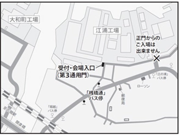 2.工場及び工場周辺には駐車場がありませんので、ご来所の際は公共交通機関を利用ください。