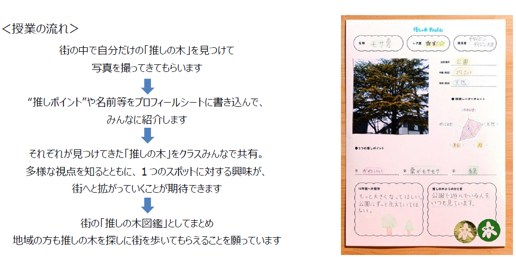 小学生に街の環境に大きな影響を及ぼす「木」の存在に注目してもらい、小学生一人一人に自分の推し※の木を纏め、発表してもらう授業。