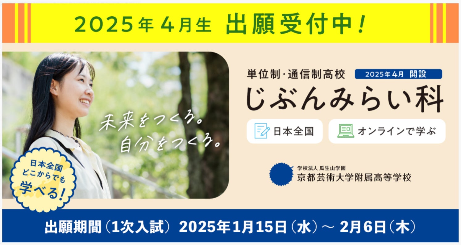 学校法人瓜生山学園 京都芸術大学附属高等学校(京都市左京区/校長 鈴木克治)では、2025年4月に日本全国どこからでもオンラインで学習できる単位制・通信制の「じぶんみらい科」を新設。2025年度出願期間が2025年1月15日(水)から始まりました。
