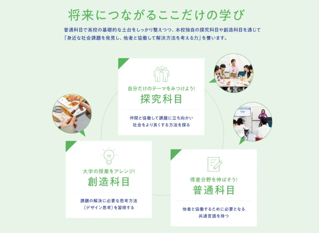 「普通科目」で高校の基礎的な土台をしっかり整えつつ、「探究科目」や本校独自の「創造科目」を通じて、社会で求められる力を養います。大学連携や独自のカリキュラムにより、他校にはない特色ある学びを提供し、将来の進路や社会での活躍につながる教育を実現。「身近な社会課題を発見し、他者と協働して解決方法を考える」実践的なスキルを身につけられます。