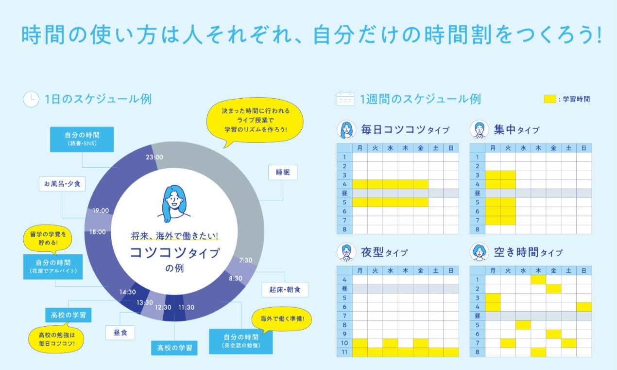 ・学ぶ時間やペースを自分で決めることができるので、自分にあった学習方法が見つかります。「自分の時間」を含めた時間割を自由に決められます。