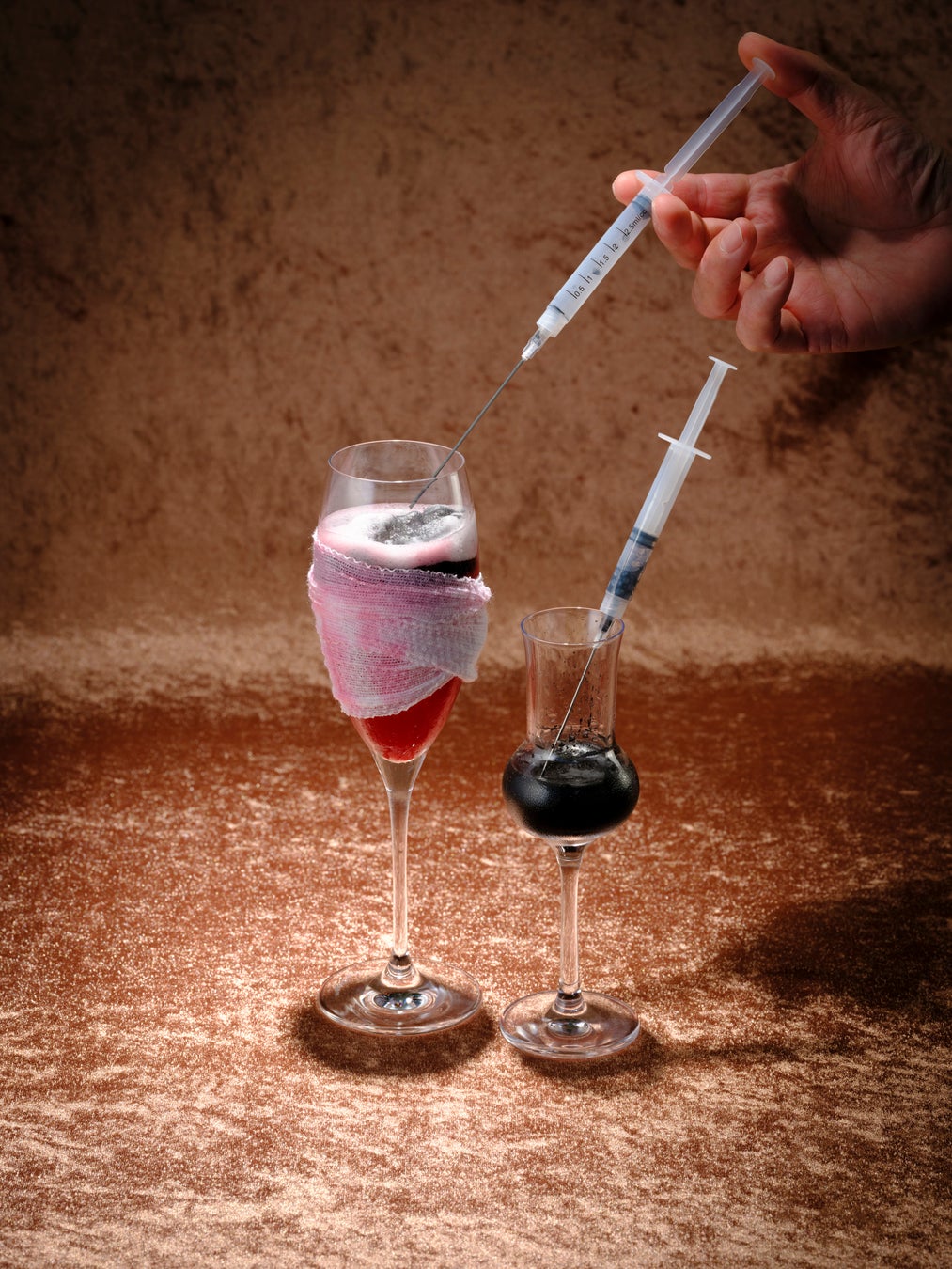 注射器で瞬く間に色が変化する包帯で巻かれたカクテルグラスが目を引くノンアルコールカクテル
