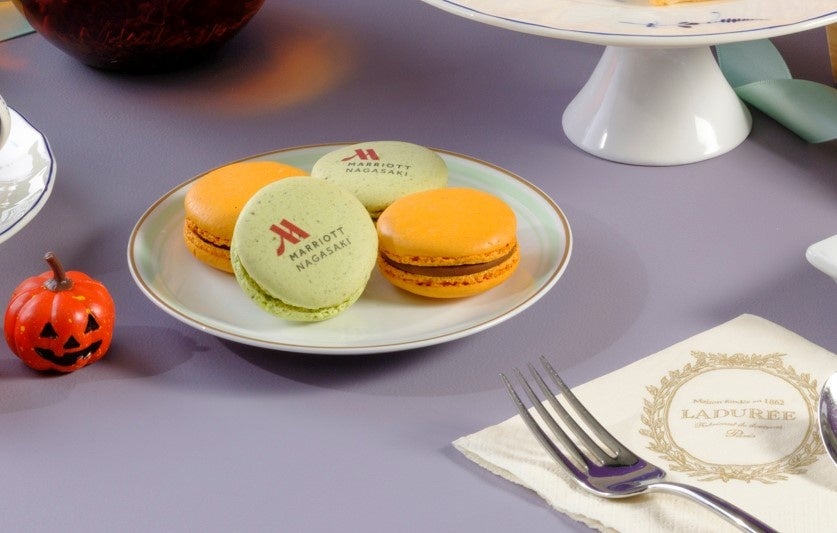 九州では長崎マリオットホテル限定販売となるラデュレの季節限定フレーバー「ハロウィン・ショコラ・オ・レ・プラリネ」と定番の人気フレーバー「ピスタッシュ」に長崎マリオットホテルのロゴをあしらった2種類のマカロンが付いた数量限定メニューです。
