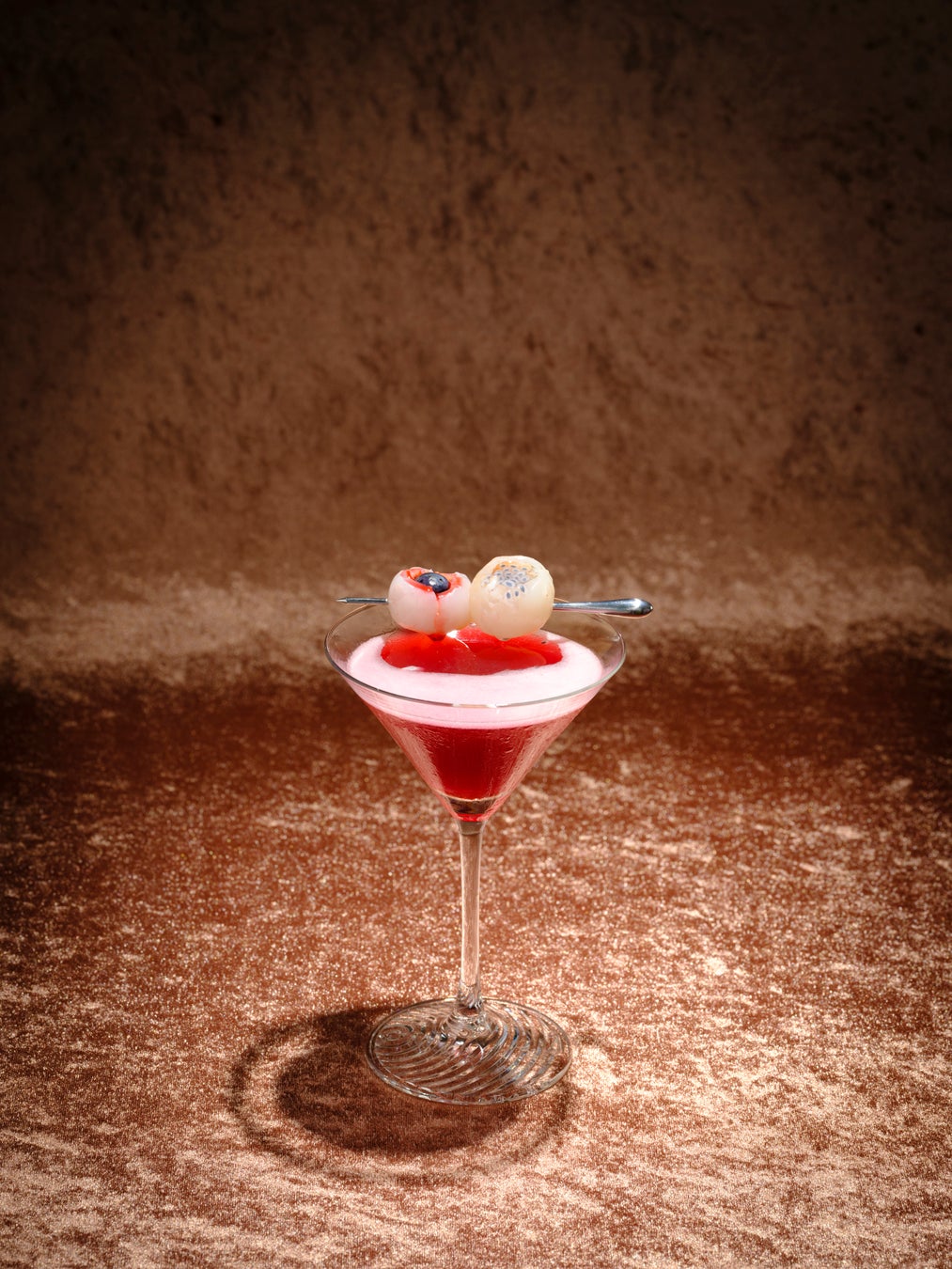 不気味なライチの目玉がこちらを見ているアップルブランデーベースのカクテル