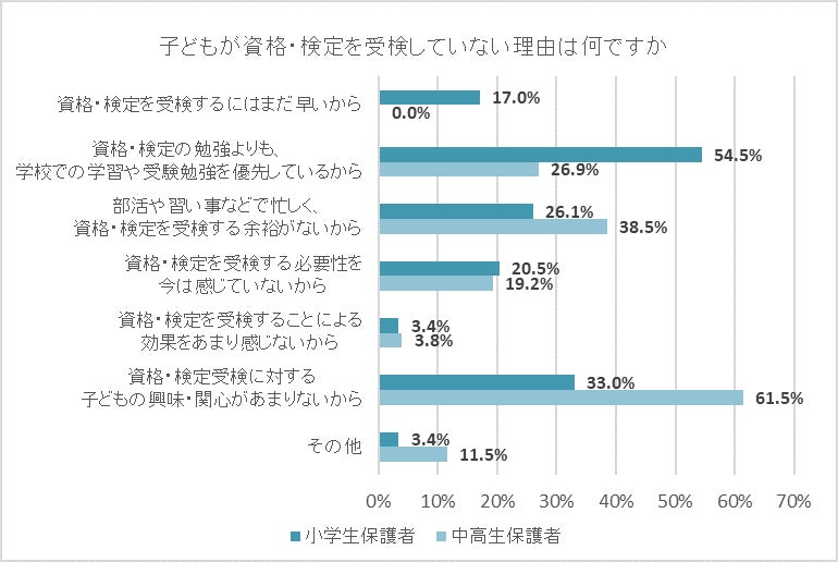 小学生保護者では、「資格・検定の勉強よりも、学校での学習や受験勉強を優先しているから」、中高生保護者では、「資格・検定受検に対する子どもの興味・関心があまりないから」という理由が多かった。