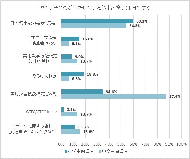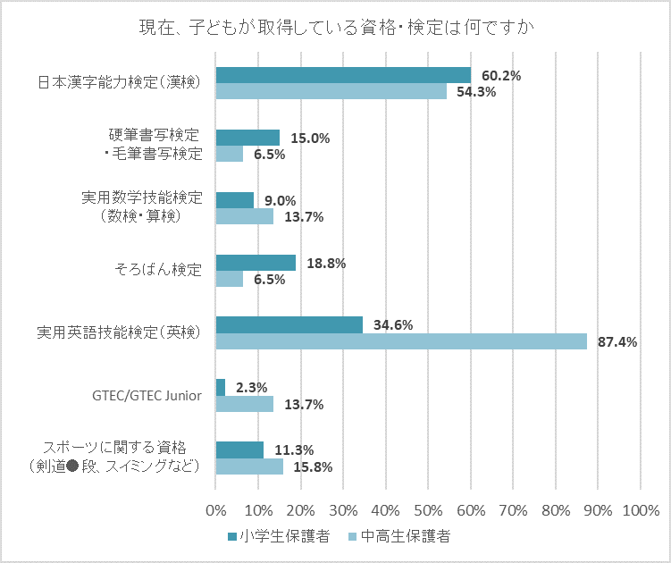 - 取得している資格・検定 小学生は「漢検」、中高生は「英検」が最多
