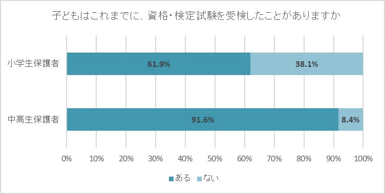 小学生保護者の61.9%、中高生保護者の91.6%が、子どもが資格・検定試験を受検したことが「ある」と回答した。