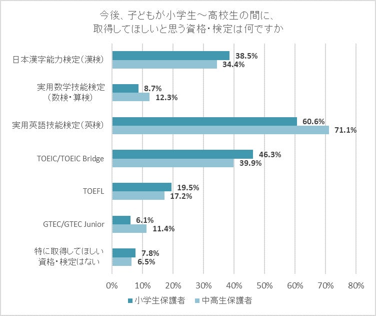 最も多かったのは、小学生保護者・中高生保護者とも「実用英語技能検定(英検)」、次いで「TOEIC/TOEIC Bridge」が多く、英語に関する資格・検定を取得してほしい、と考えている保護者が多いことが明らかとなった。