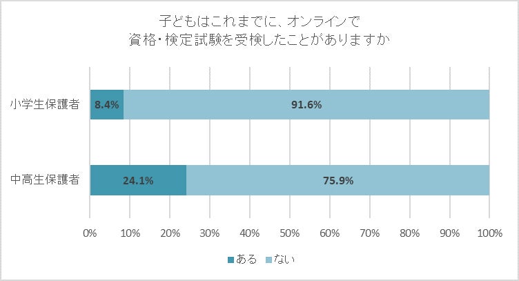 子どもがオンラインで資格・検定試験を受検したことがあると回答したのは、小学生保護者の8.4%、中高生保護者の24.1%だった。