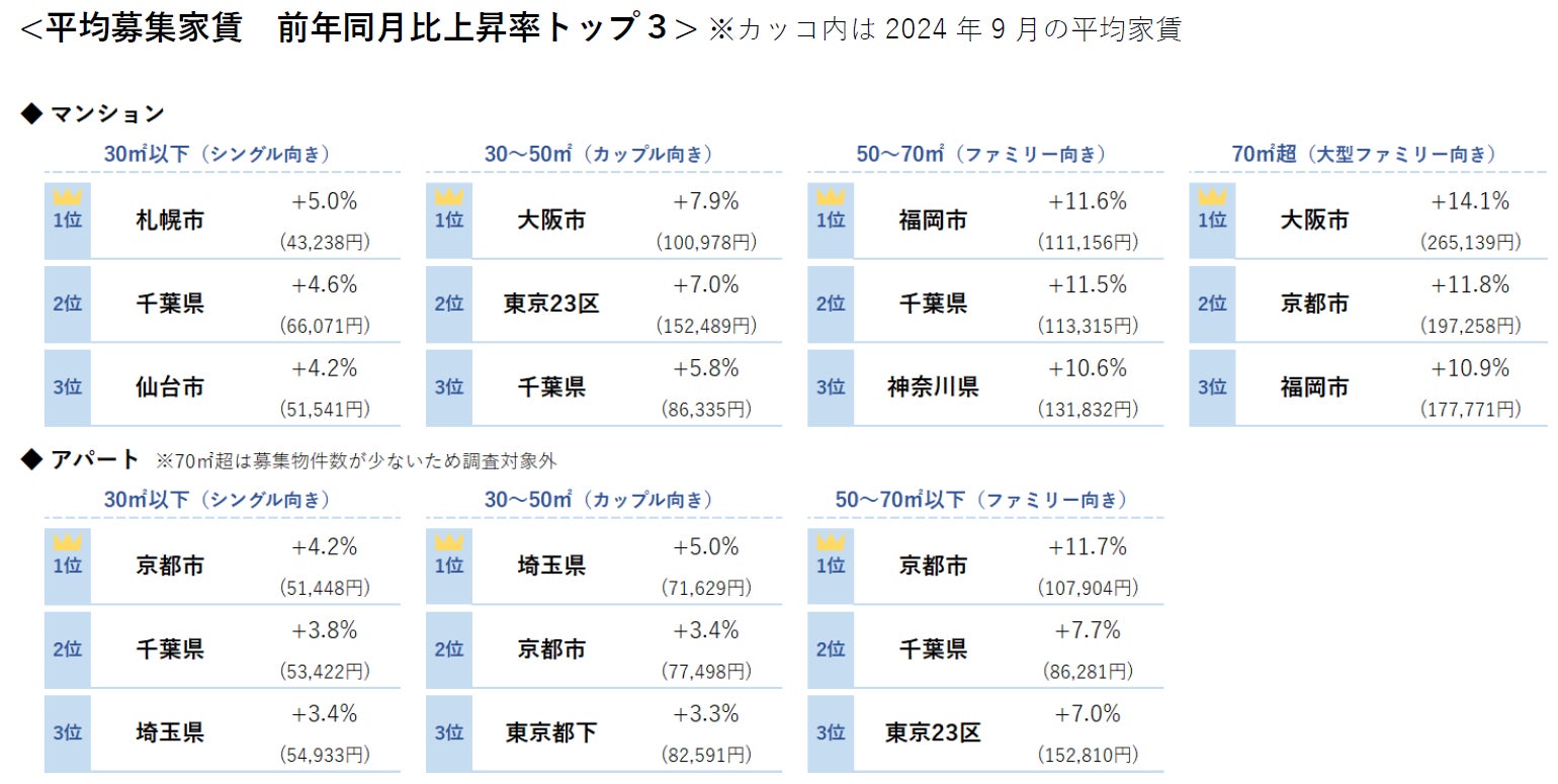 <2024年9月 全国主要都市における賃貸マンション・アパートの平均家賃(面積帯別)>