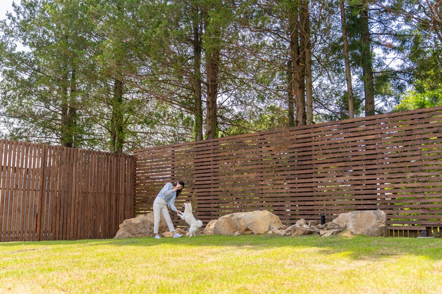 約100㎡の専用ドッグラン付きで、広々とした芝生の上を自由に駆け回ることができます。ペット用のアメニティも完備し、大切な家族の一員であるワンちゃんとともに、心からリラックスできる滞在をお楽しみください。