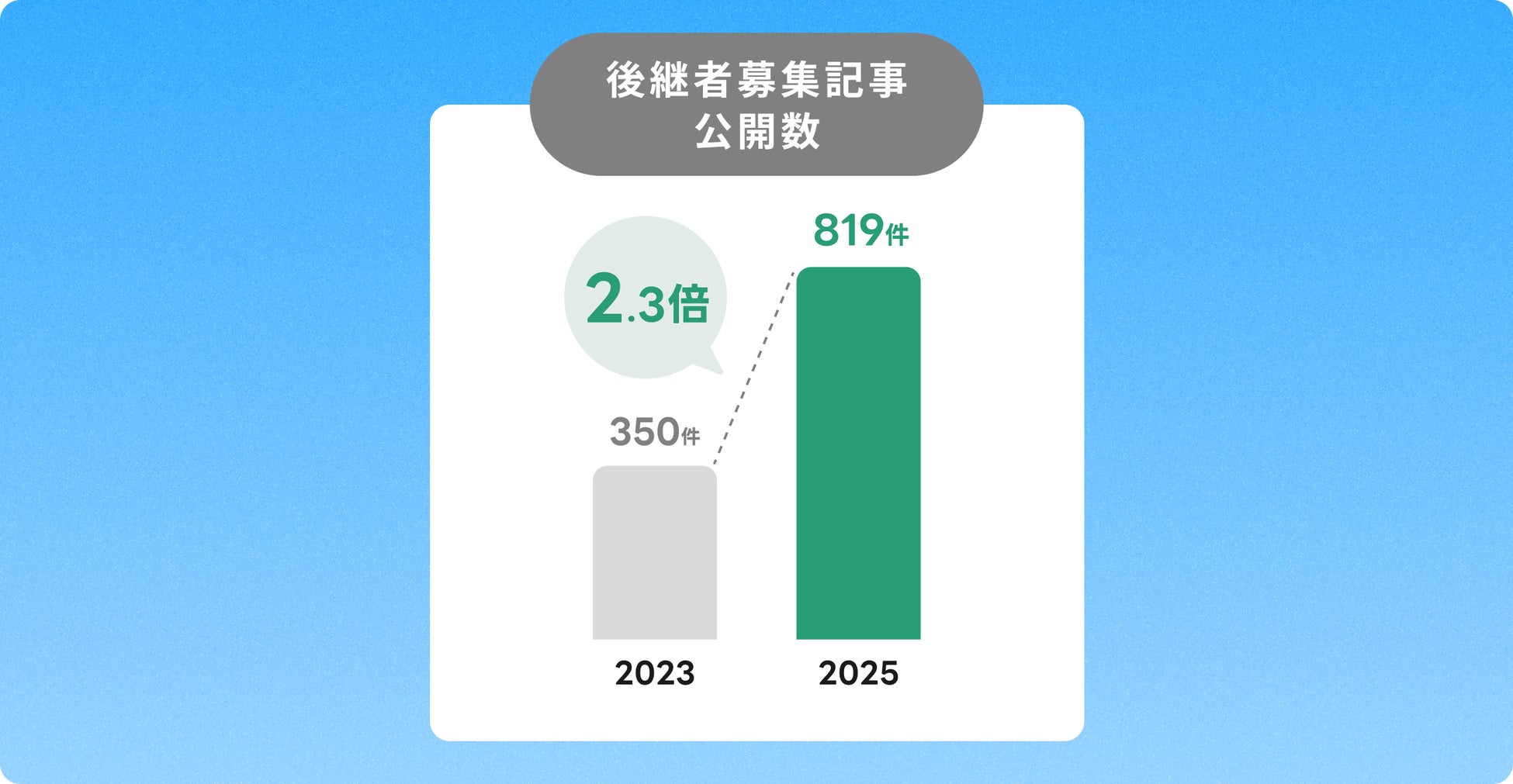 一方で、後継者募集記事の公開数は230%の成長に留まっており、他の指標と比べると伸び方に差があります。
