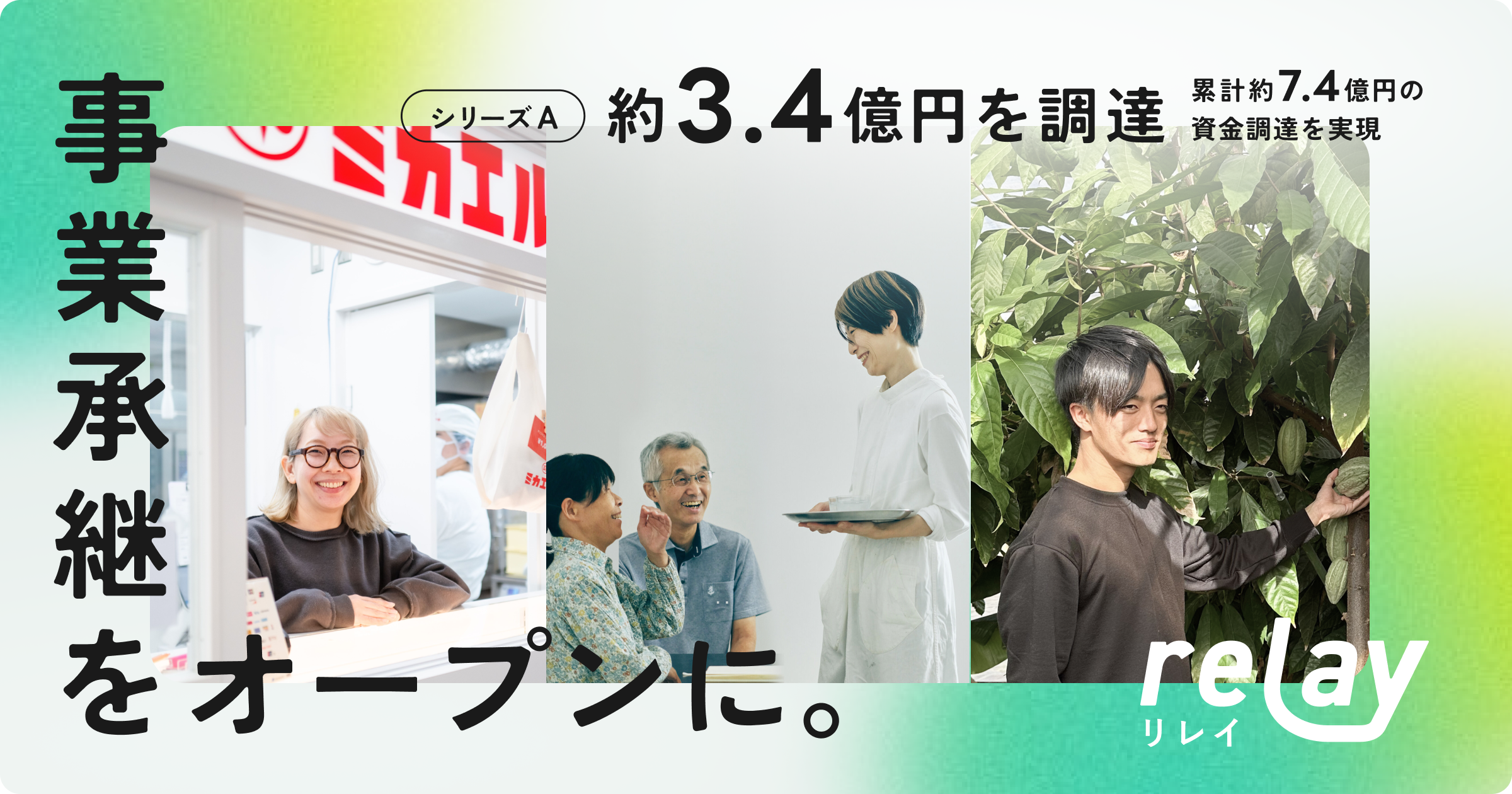 事業を譲りたい人と継ぎたい人を“共感”でつなぐオープンネーム(実名開示)型のプラットフォーム、オープンネーム事業承継「relay(リレイ)」(運営会社:株式会社ライトライト、本社:宮崎県宮崎市、代表取締役:齋藤 隆太、以下、relay)は、このたびシリーズAラウンドにおいて総額3.4億円の資金調達を実施しました。