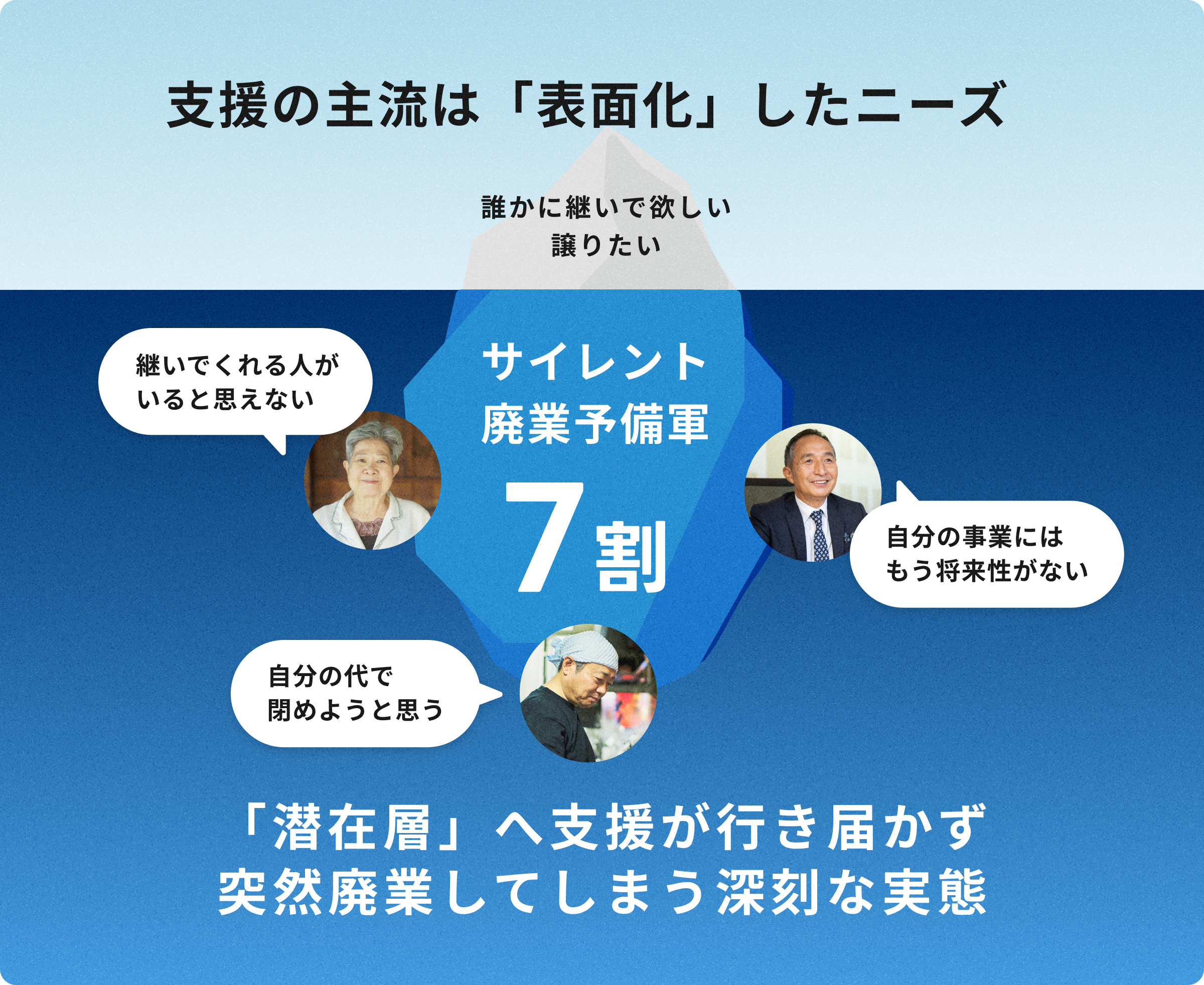 事業承継という選択肢を検討する機会がないまま、地域の事業が静かに姿を消していく――その層への支援の少なさこそ、日本各地で多くの廃業を引き起こしている要因の一つと考えられます。