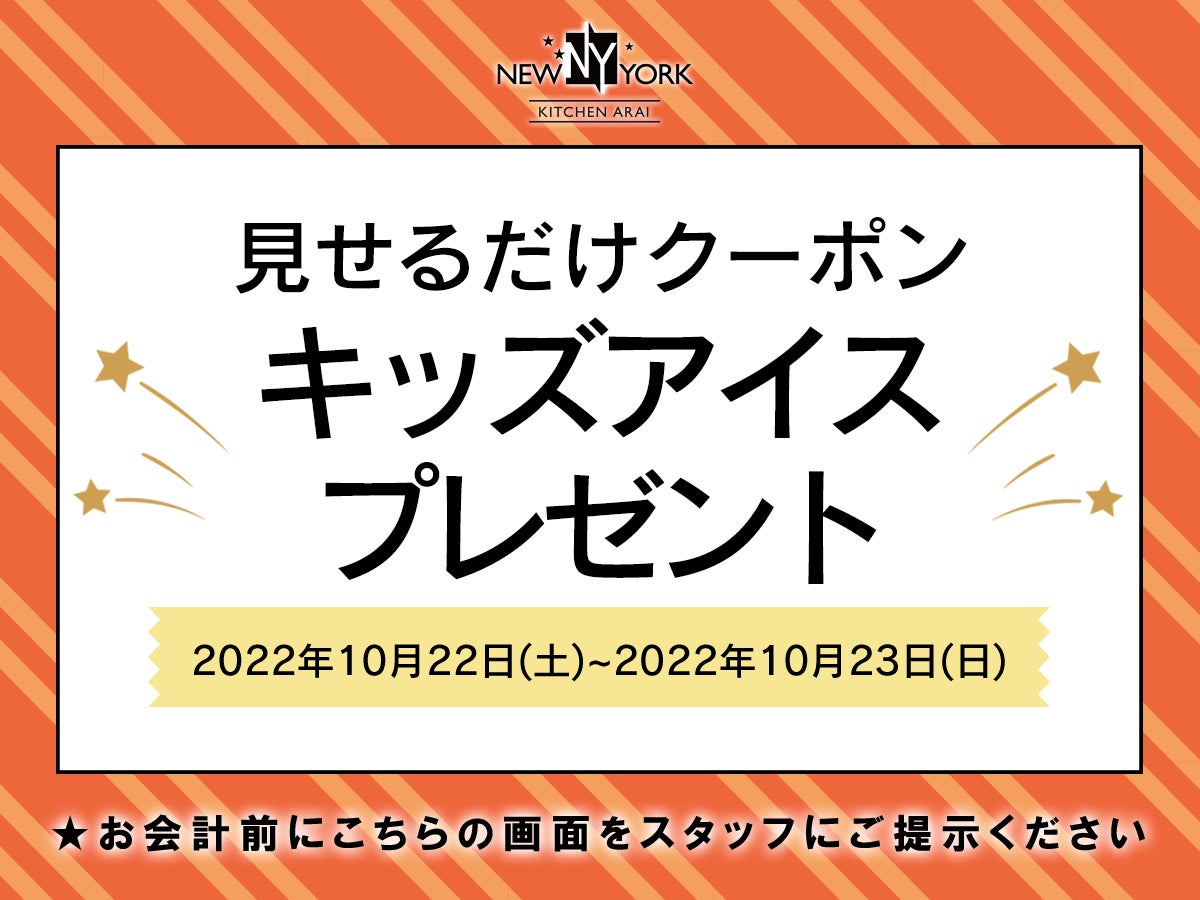 New York Kitchen ARAI(ニューヨークキッチンアライ)イオンスタイル碑文谷店7階(運営:株式会社RAVIPA 本社:東京都豊島区)では、「ただいま東京プラスス」実施に際し、当店独自のキャンペーンをスタート。今回はキッズ限定でアイスをプレゼント致します。本PRに掲載の画像を会計時にご提示ください。