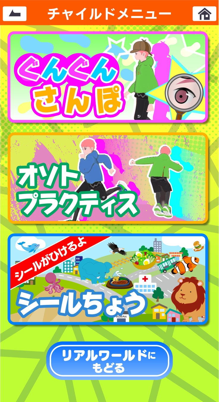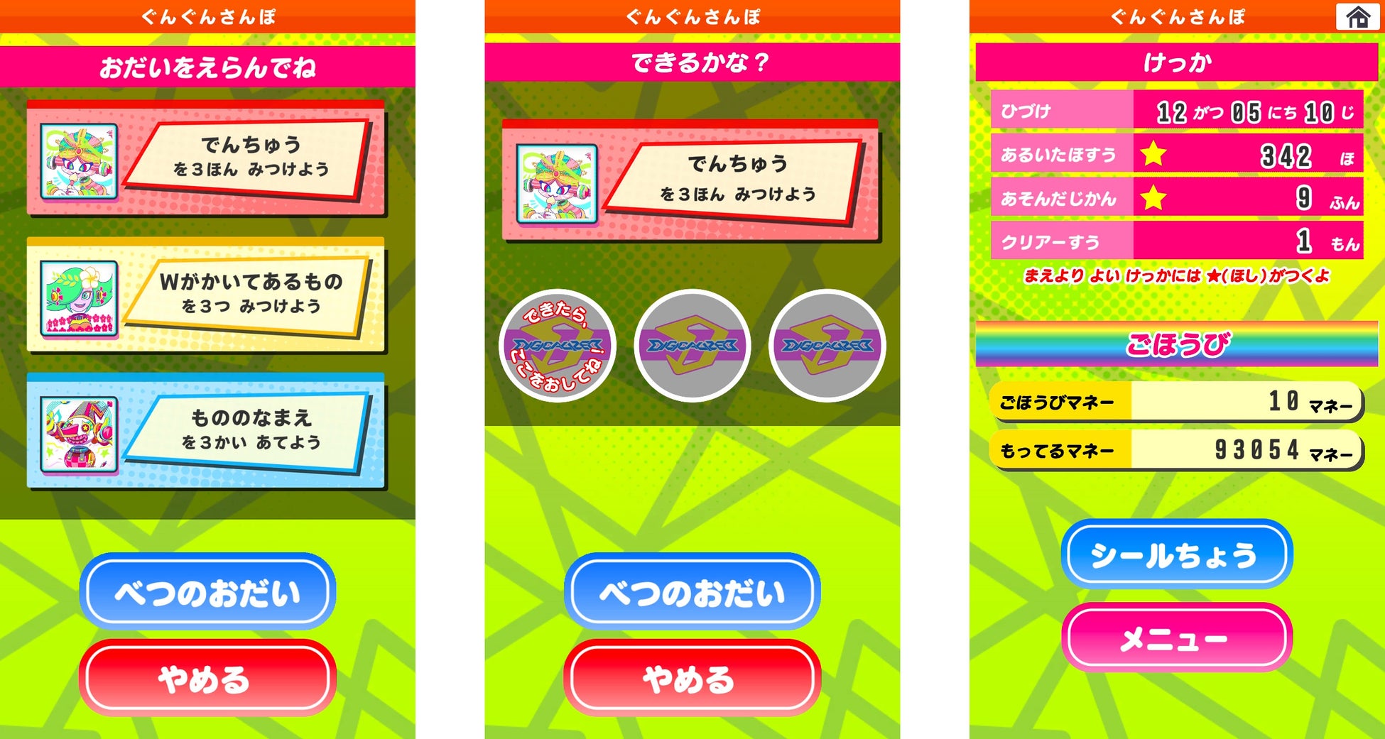 「あかいろのものを3つみつけよう」等といったお題を選んで、親子でお散歩しながらみつけたり、当てたりしていきます。お題をクリアすると報酬としてゲーム内ポイントがもらえます。