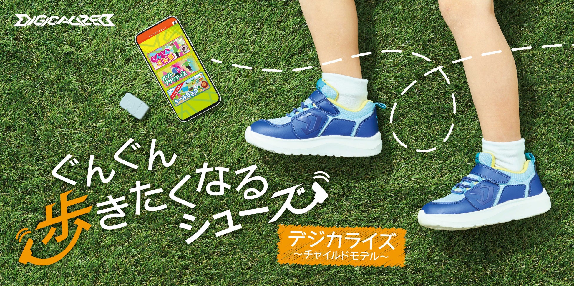 「ぐんぐん歩きたくなるシューズ デジカライズ」のキャッチコピーを掲げ、アプリと連動することで未就学児のお子様が親子で楽しみながらたくさん歩いて運動してほしいシューズとなっています。
