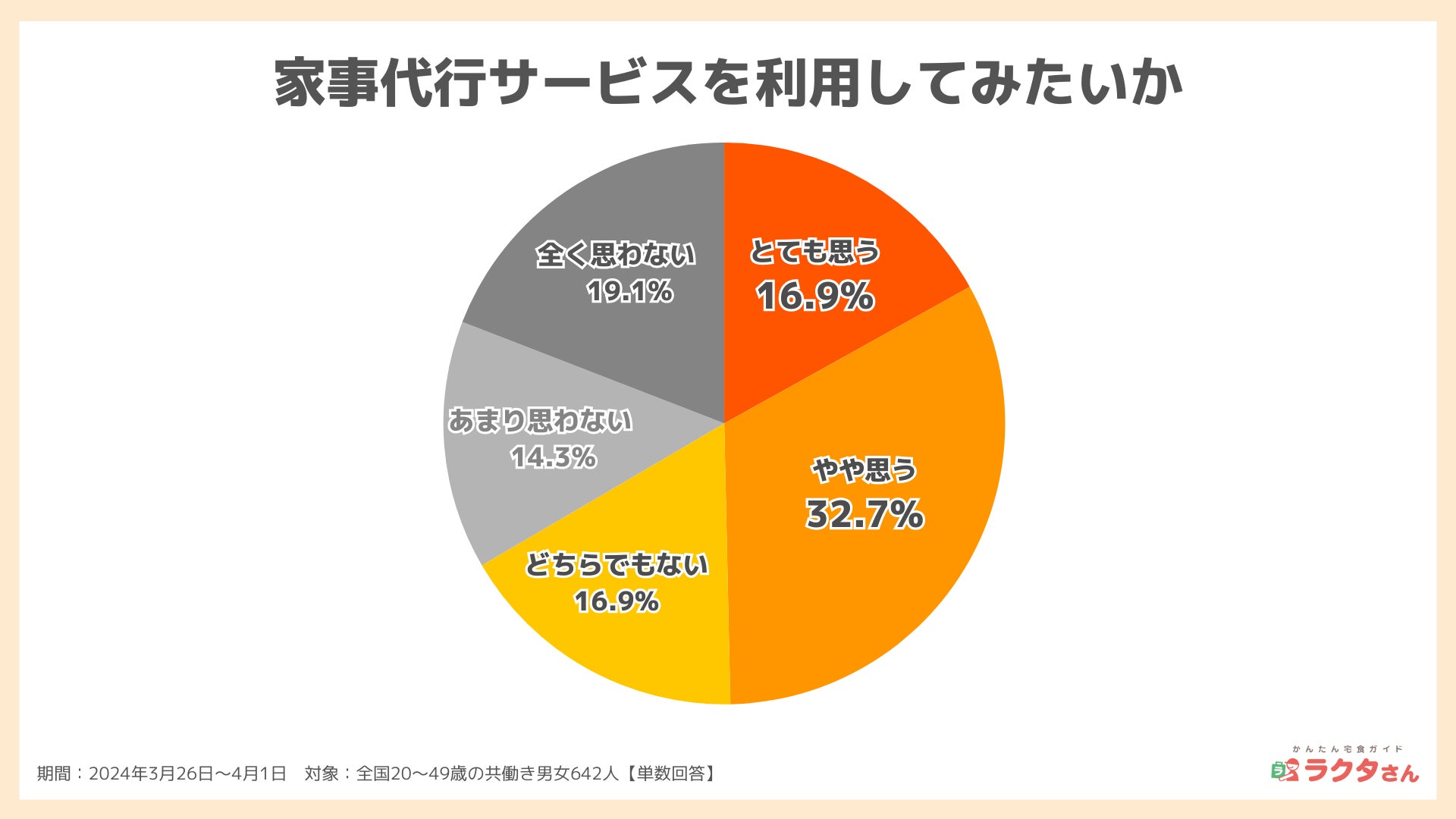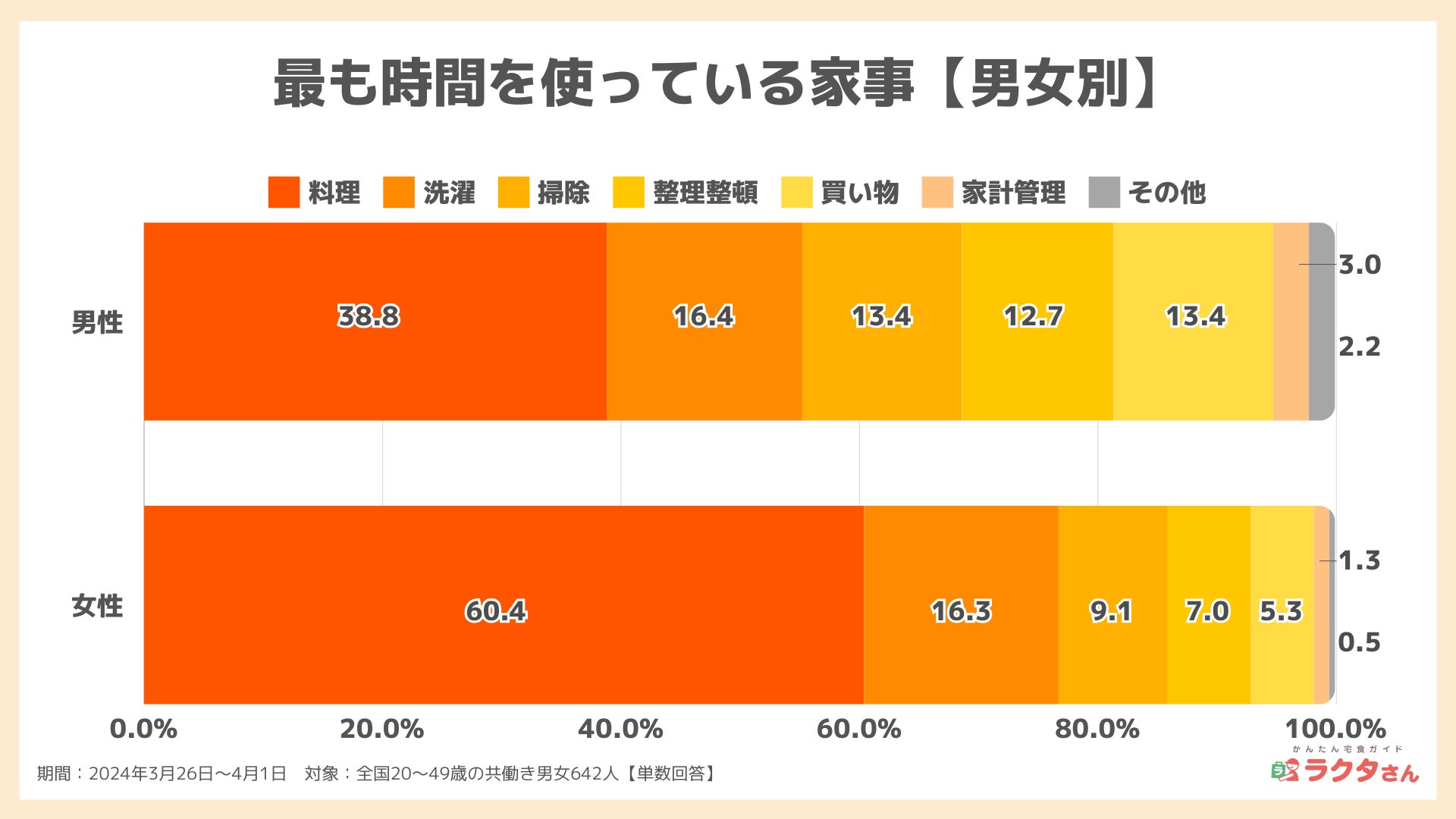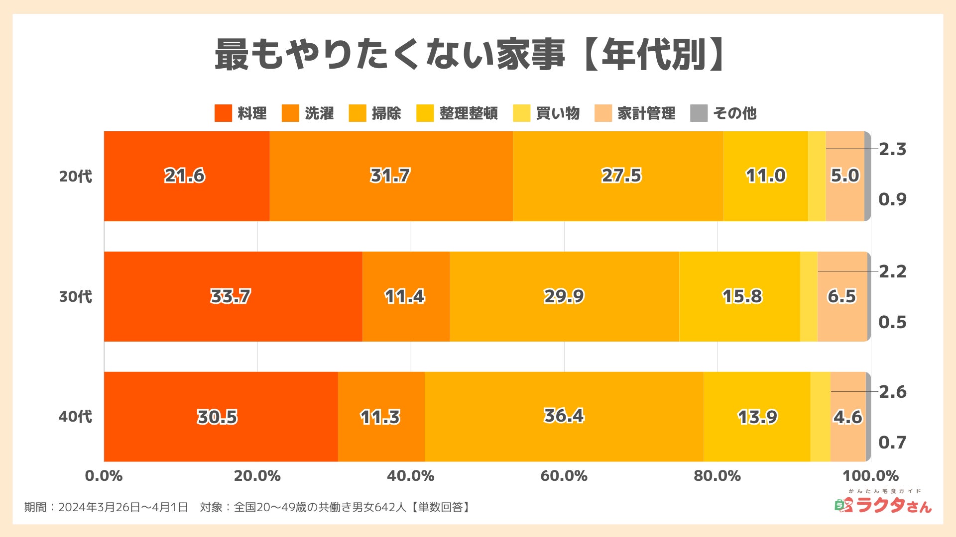 【家事の悩み】最も時間がかかるのは「料理」、嫌いな家事1位は「掃除」、約半数が有料の家事代行サービスの利用意向有(かんたん宅食ガイド ラクタさん調べ)