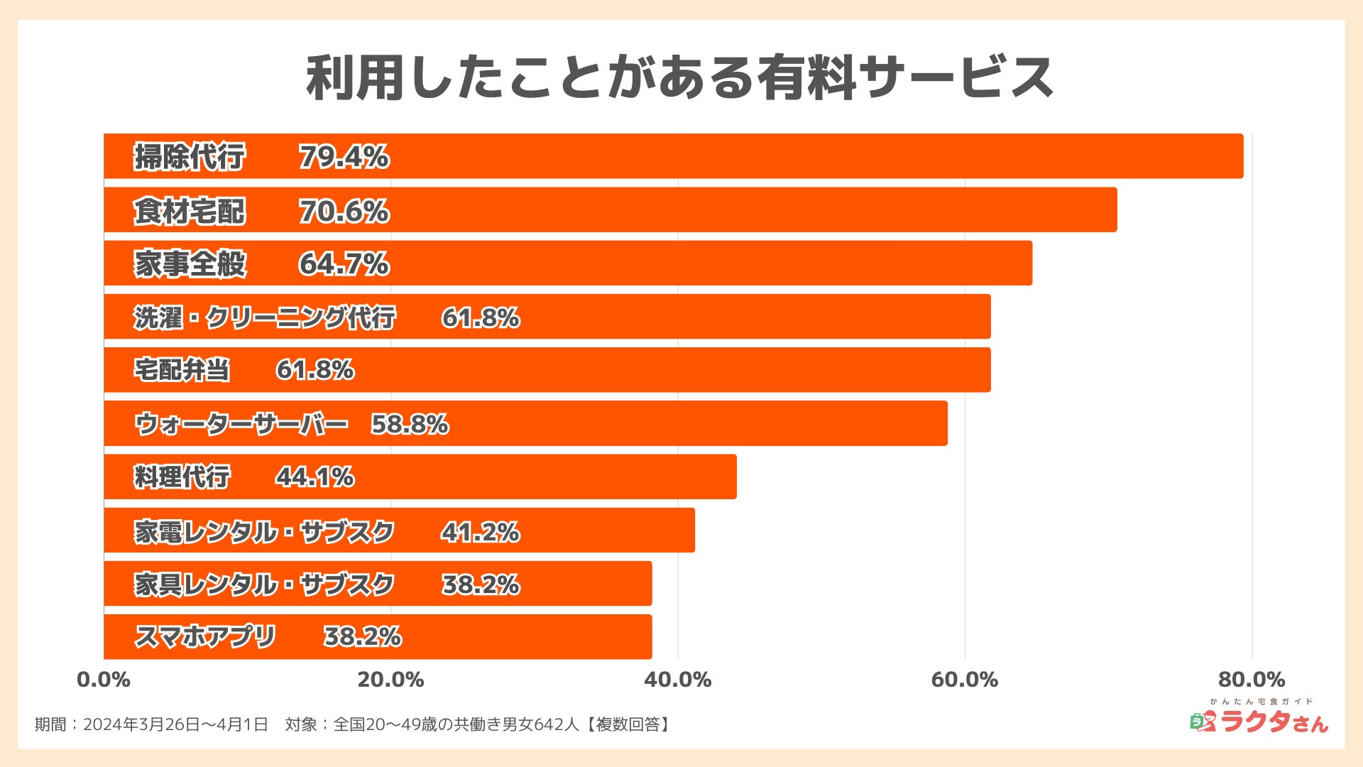 最後に、家事に関する有料サービスの利用経験について聞いてみたところ、最も利用者が多かったのは「掃除代行(79.4%)」、次いで「食材宅配(70.6%)」、「家事全般の代行(64.7%)」でした。