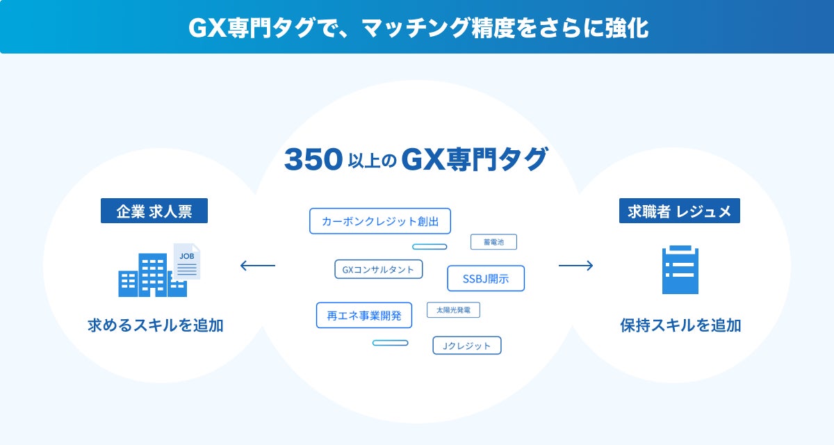 アスエネ株式会社(本社:東京都港区、代表取締役CEO兼COO:西和田 浩平、以下「当社」)が提供するGX・ESG人材特化型転職プラットフォーム「ASUENE CAREER」は、カーボンニュートラルへの移行に向けGXリーグ内のGX人材市場創造が策定した「GXスキル標準ver.2」に基づき「GX専門タグ」を追加しました。「GX専門タグ」は、GXに関するスキルを言語化し、350項目以上に分類・設定し、より精度の高いマッチングを実現します。企業のGXビジネスや脱炭素経営を支える人材のマッチング精度の向上と採用工数削減を図り、GX人材市場のさらなる拡大を目指します。