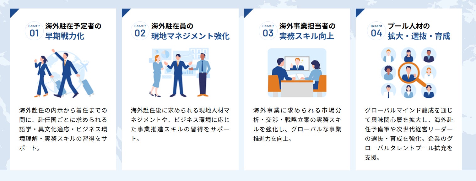 実践経験豊富な講師によるサポートに対する評価は高く、顧客企業が必要とする人材や国別にカスタマイズされたEラーニング、研修、語学などのプログラムは高い満足度を実現しており、グローバル人材育成を加速させたい企業のパートナーとなっている。