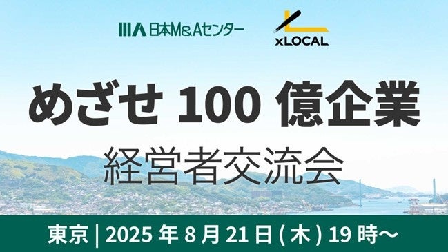 株式会社日本M&Aセンターホールディングス(本社:東京都千代田区 / 代表取締役社長:三宅 卓)の連結子会社である株式会社日本M&Aセンター(以下、日本M&Aセンター / 本社:東京都千代田区 / 代表取締役社長:竹内 直樹)は、株式会社XLOCAL(クロスローカル / 本社:山形県鶴岡市 / 代表取締役:坂本 大典)と共催で、第1回「めざせ100億企業 経営者交流会」を8月21日(木)19時より開催いたします。