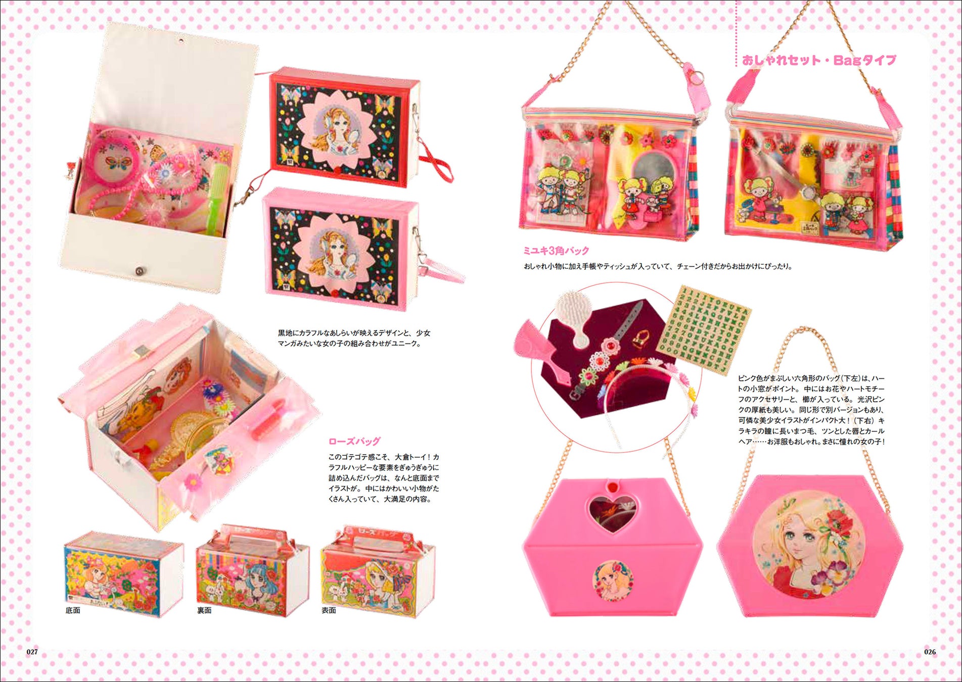 口絵/はじめに/おもちゃ紹介(おしゃれセット/おままごとセット/砂遊びセット/お勉強セット/あかちゃん人形/男の子用おもちゃ/指輪/ペンダントトップ/ネックレス/ビーズ/アクセサリー・ヘアピン/時計/鏡とくし/キーホルダー/エトセトラ)/パーツ紹介(商品シール/箱・ケース・台紙/文字/女の子の絵/ケースの彫刻装飾)/カタログ掲載